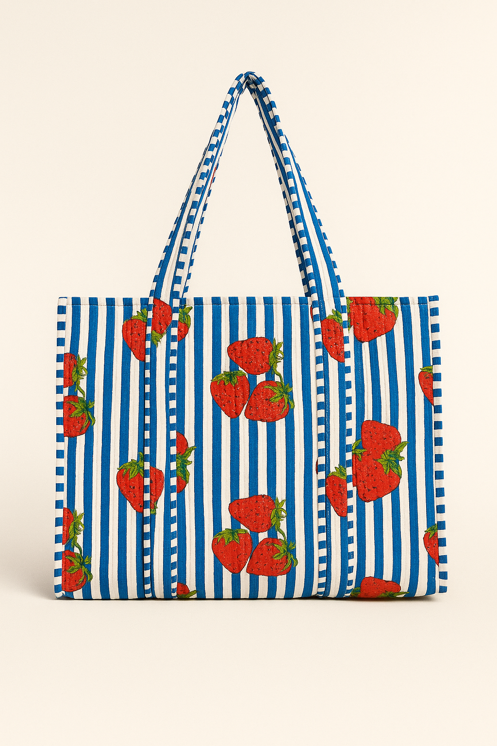 This 100% quilted cotton tote is hand block-printed and features internal pockets—perfect for everyday use or a weekend getaway. Limited quantities! Made by hand by artisans in India in limited patterns and batches.