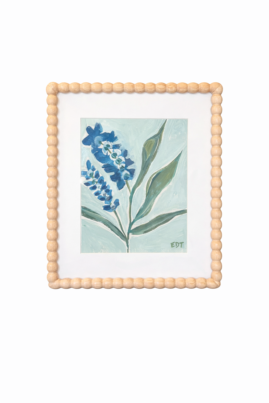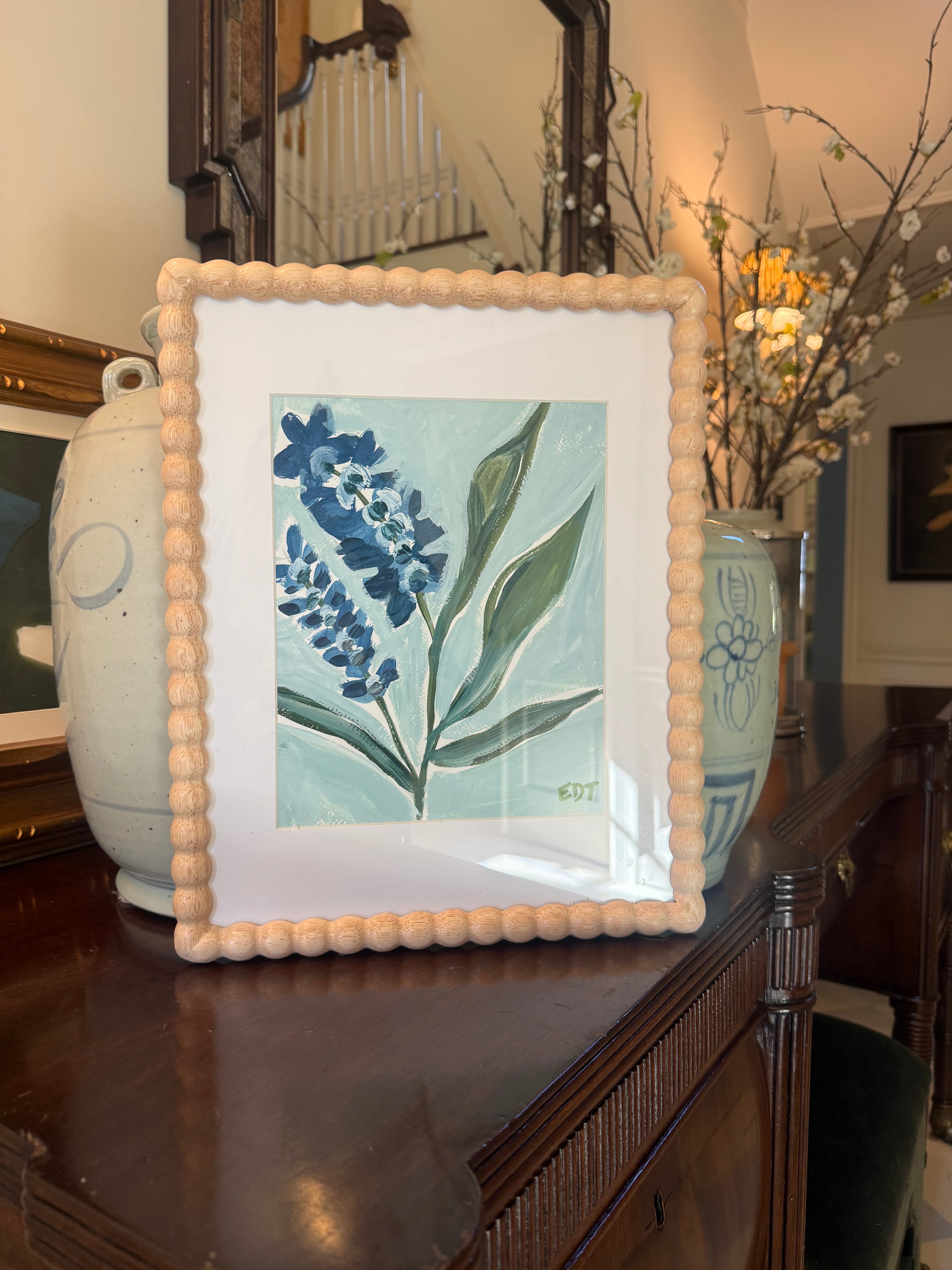 This is an original mixed media painting on canvas board created by Erin Donahue Tice. The total framed size is 14.75 × 11.75 inches. It is presented in a wooden frame. This piece is ready to hang vertically and signed on the front.