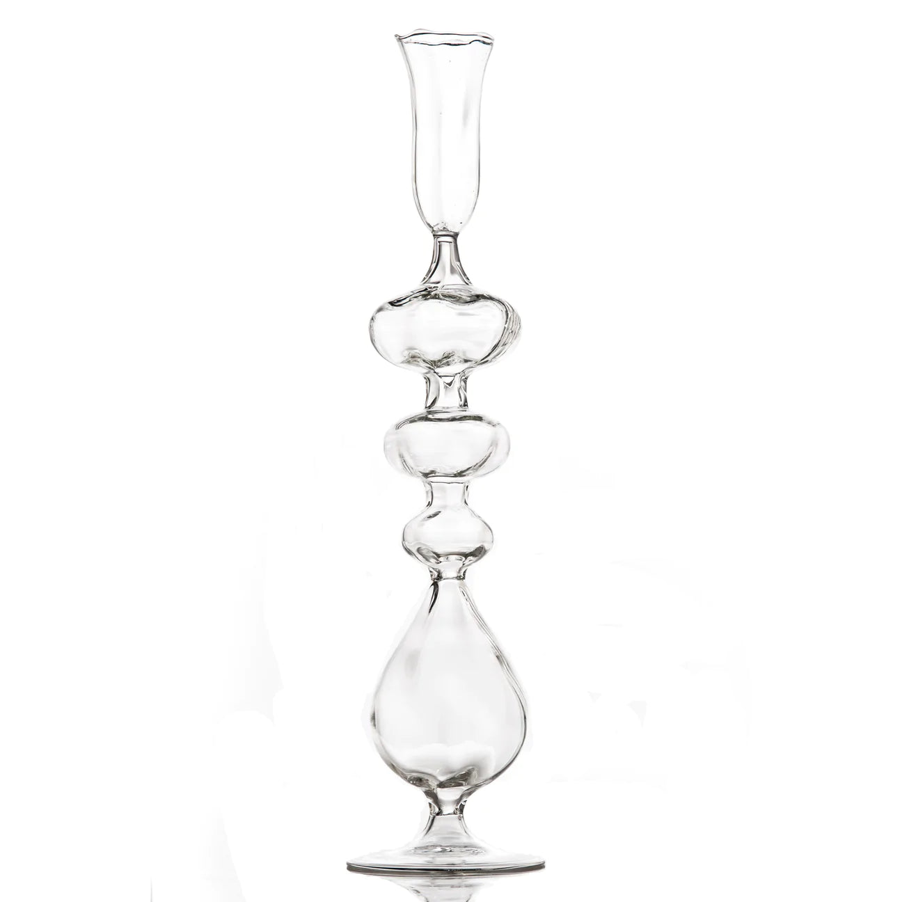 - A grouping of four mouth-blown candlesticks in clear glass, each with a different design.