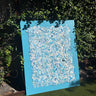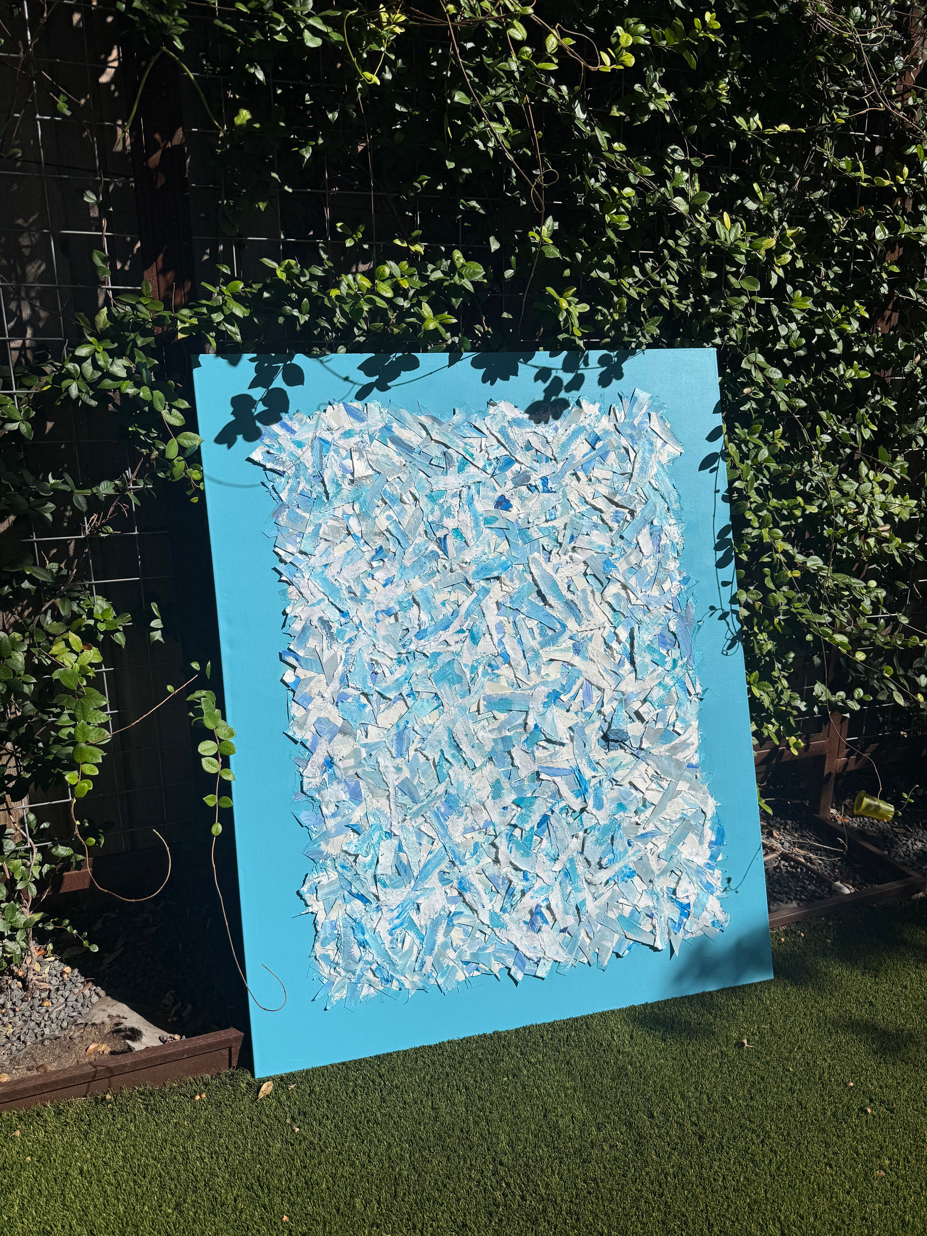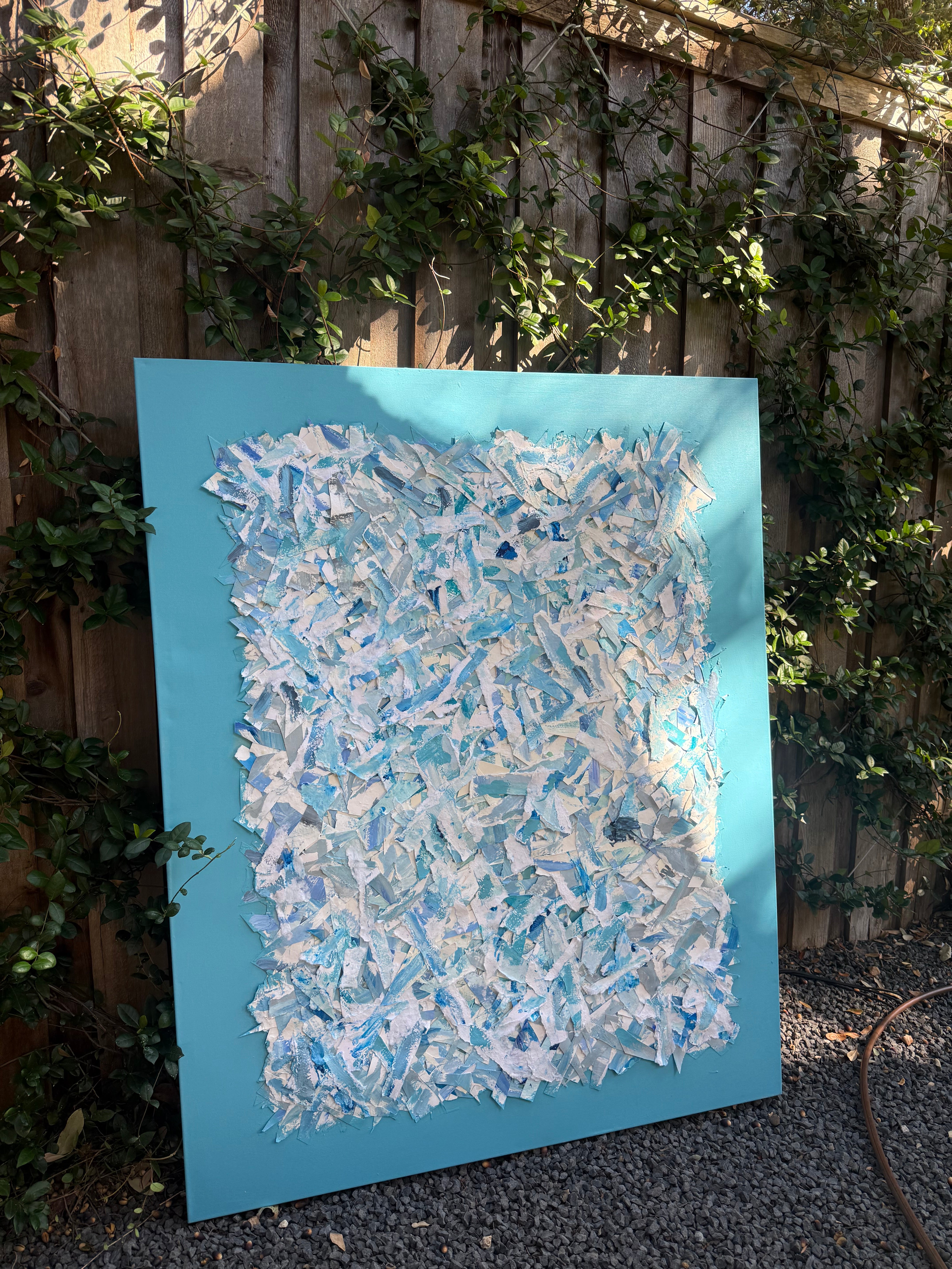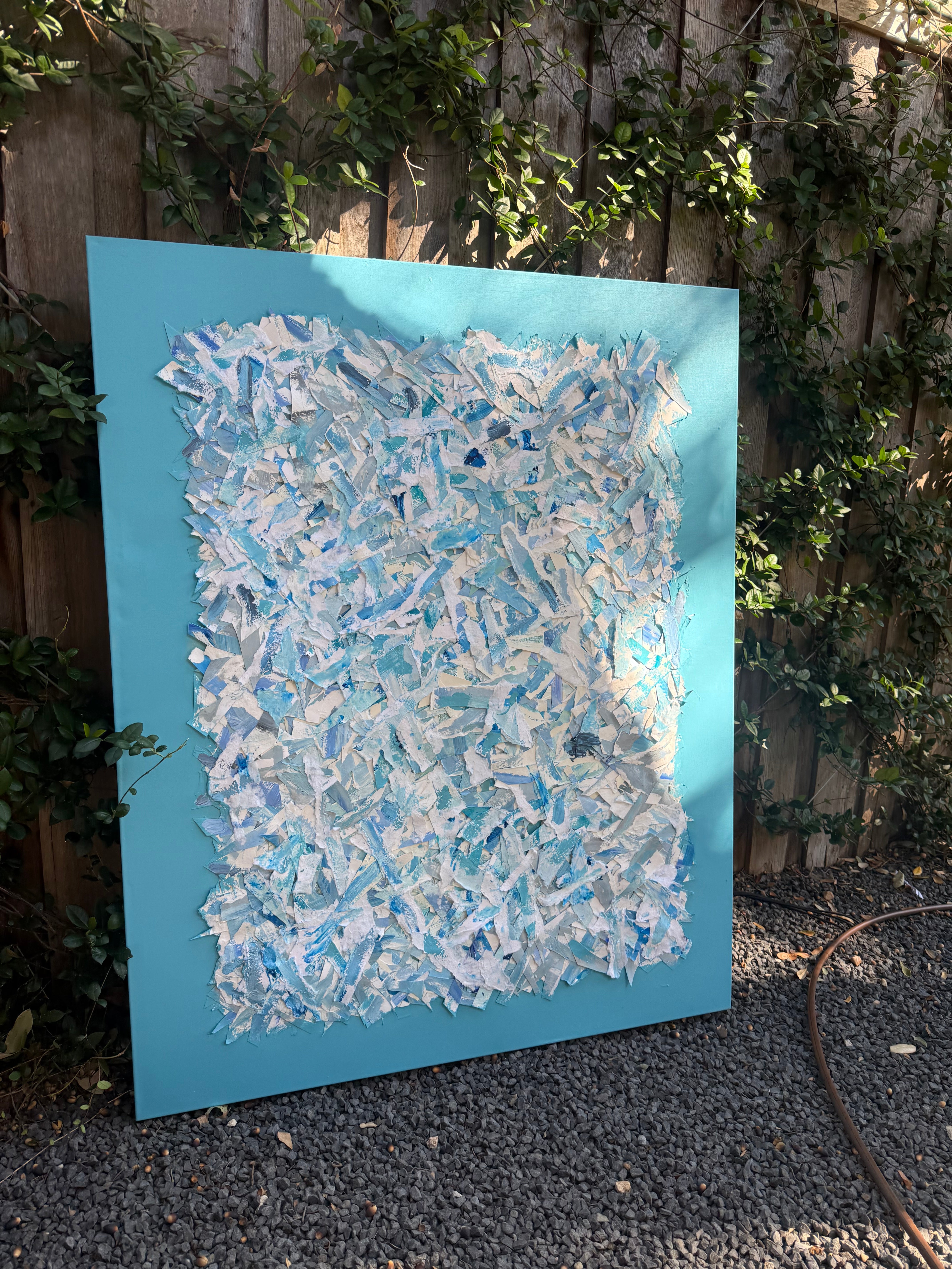 60x48 collaged canvas. Mixed media collage on canvas. This piece has hundreds of torn and cut shreds of paper on top of it. From watercolor paper to handmade paper to other materials, this layered collage makes an impact based on its layers alone. The background color is a medium blue. Unframed. A white, gold or silver float frame is available for an additional $800. Signed by artist on the back of painting..