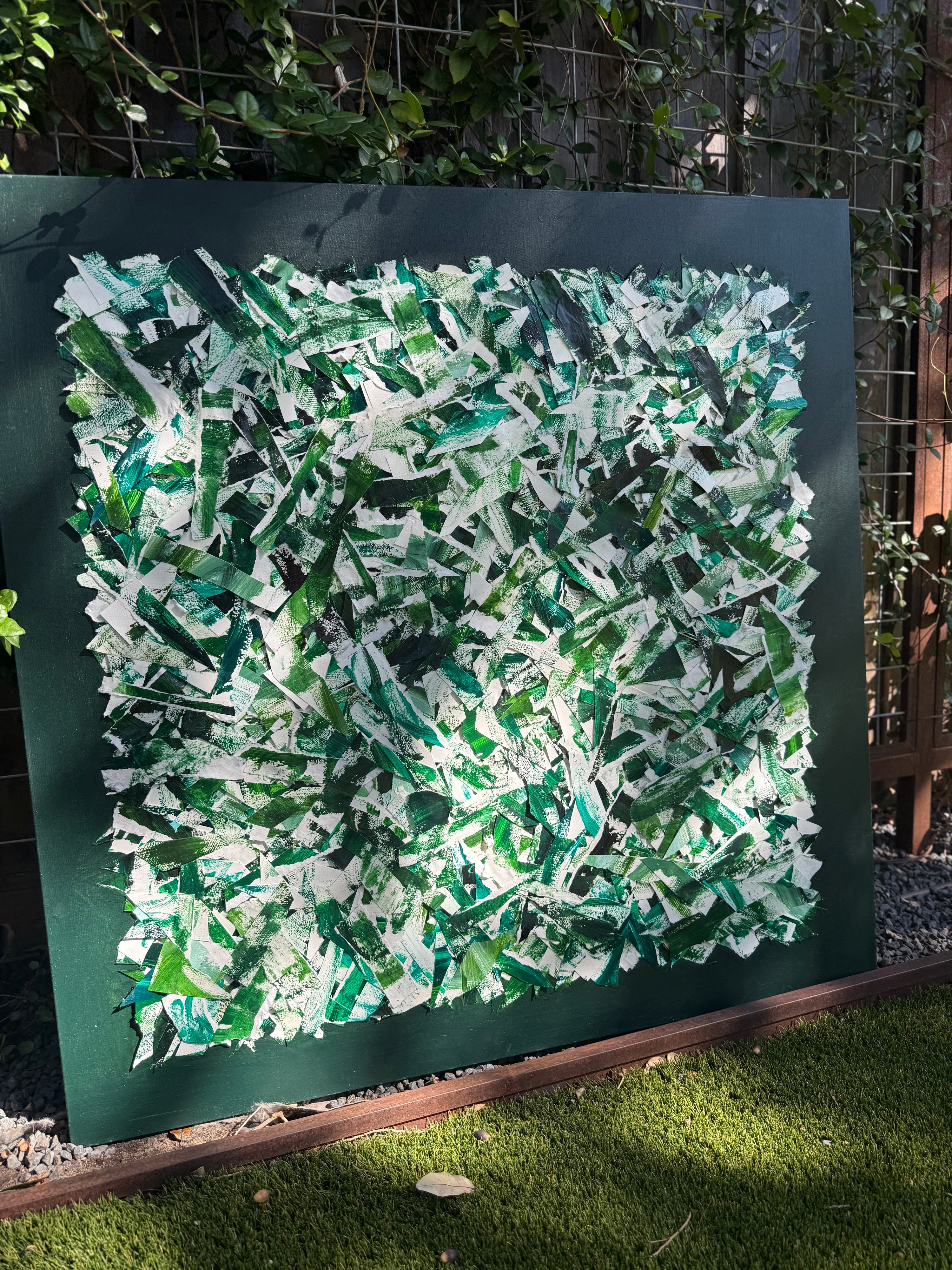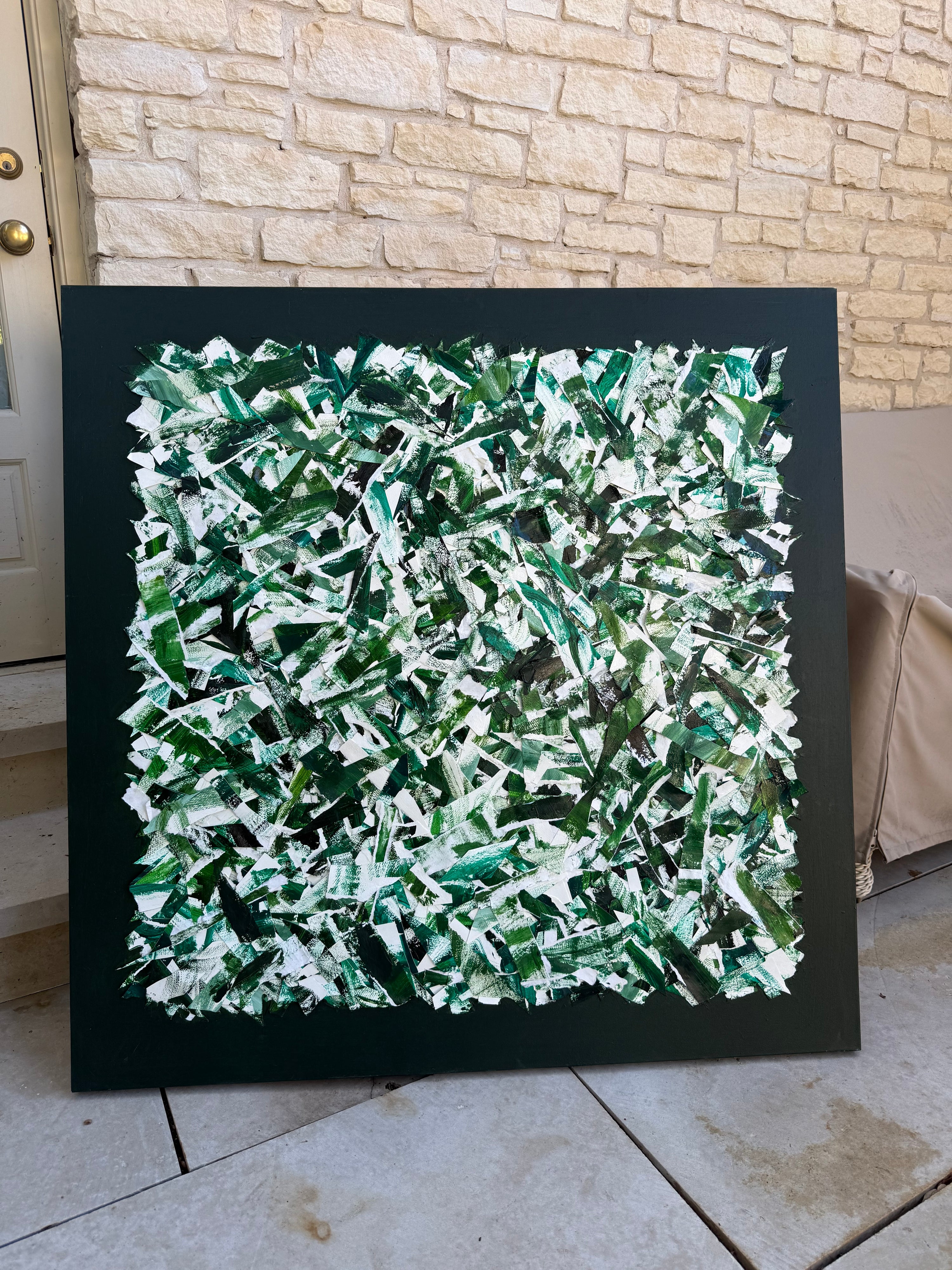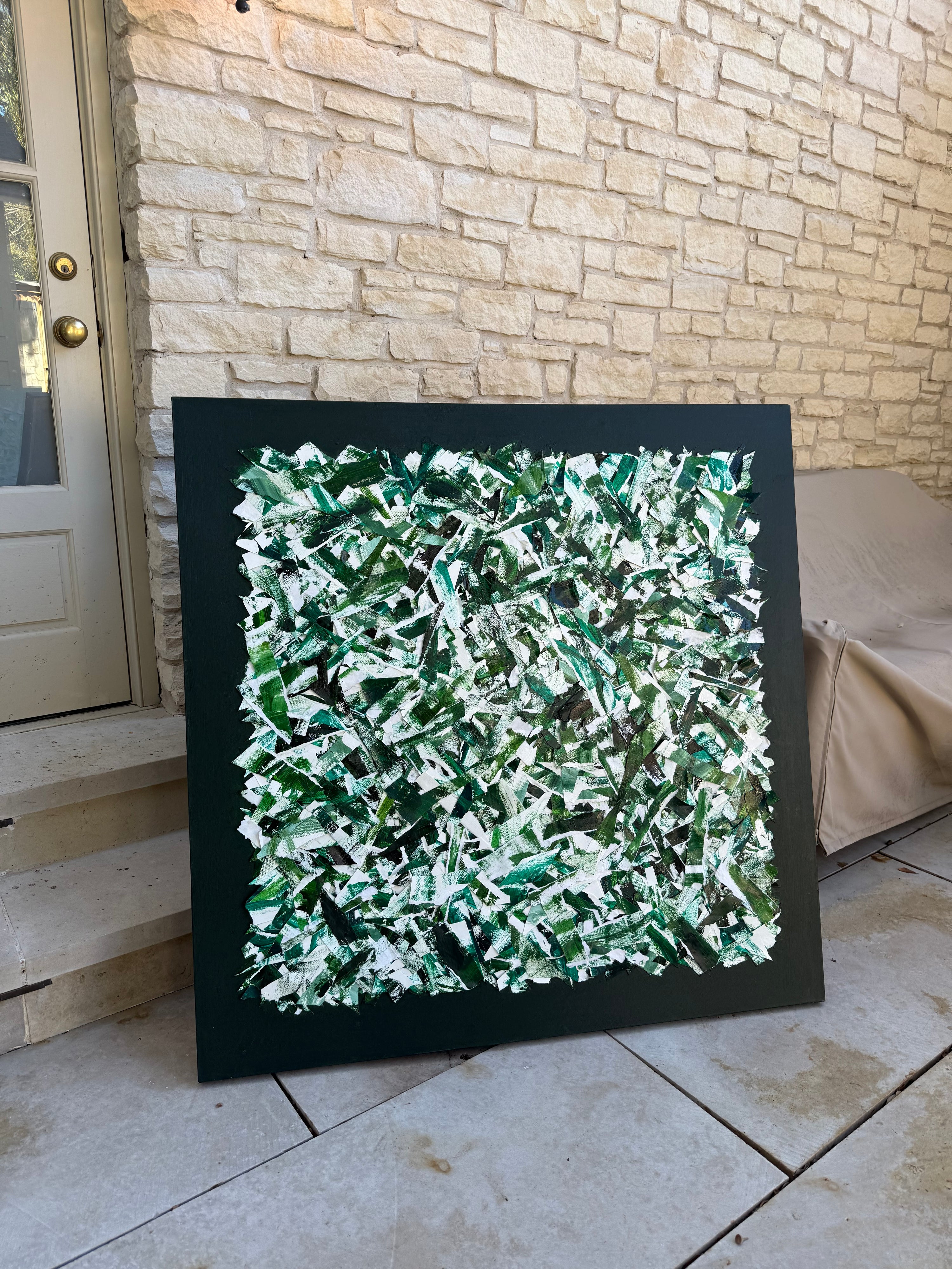 48x48 original painting. Mixed media collage on canvas. This piece has hundreds of torn and cut shreds of paper on top of it. From watercolor paper to handmade paper to other materials, this layered collage makes an impact based on its layers alone. The background color is a deep forest green. Unframed. A white, gold or silver float frame is available for an additional $700. Signed by artist on the back of painting.