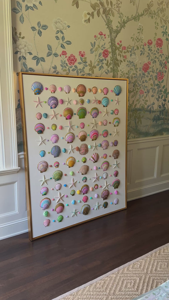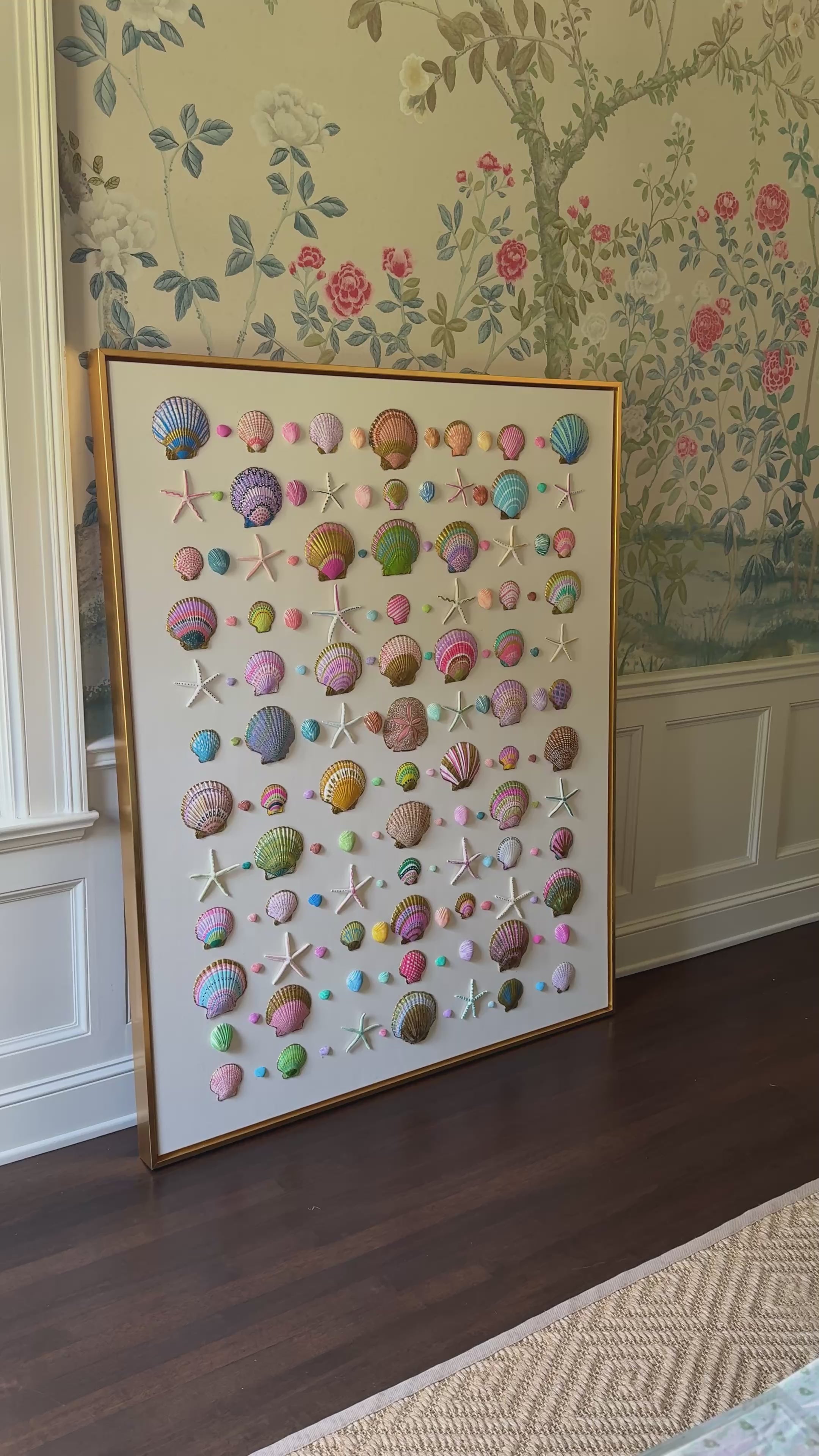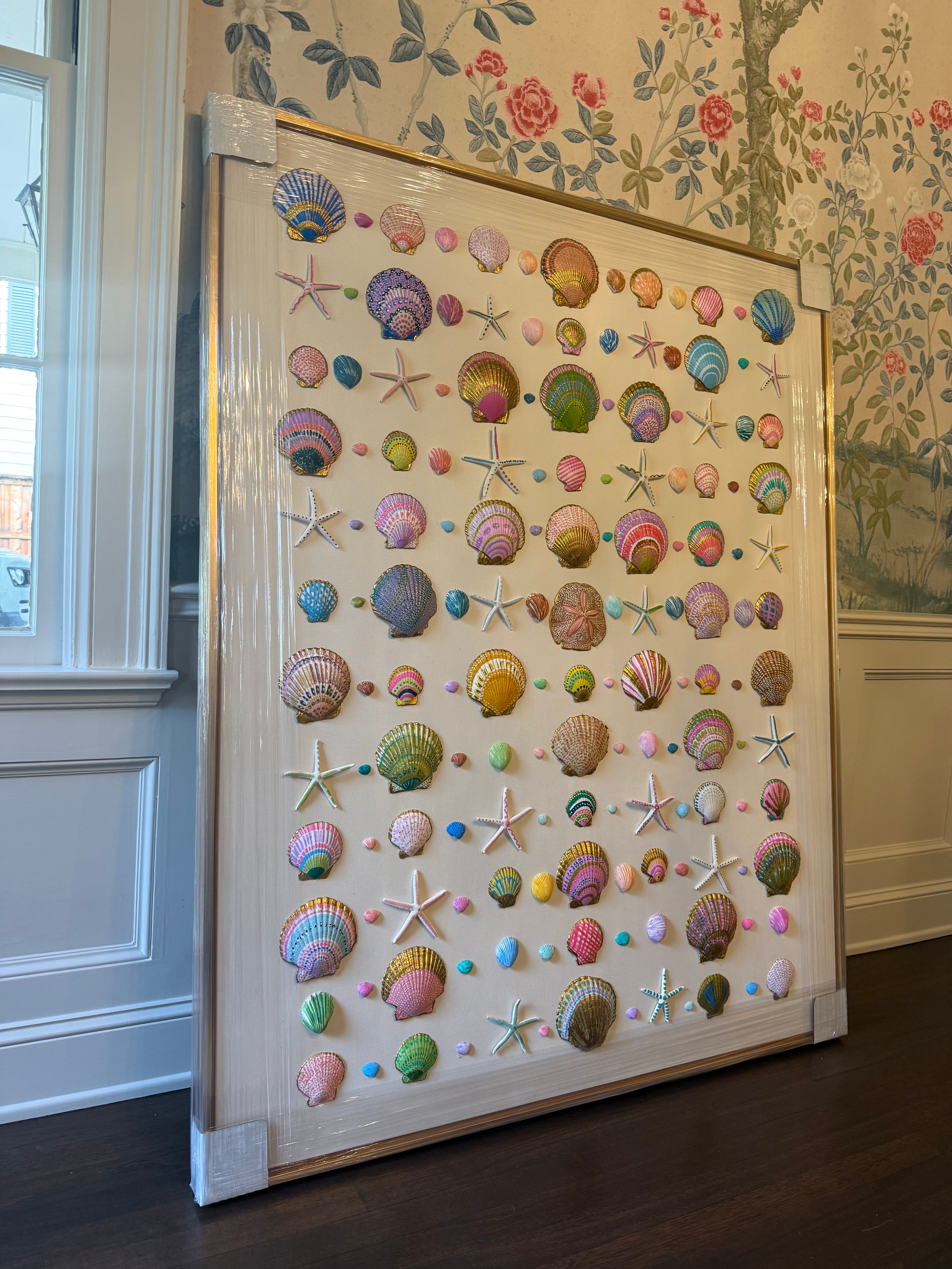 A collage of hand painted seashells, starfish and sand dollars collaged on a light pink painted canvas, custom framed in a clear UV-protected acrylic box frame. Wired and ready to hang. 60x48 inches.