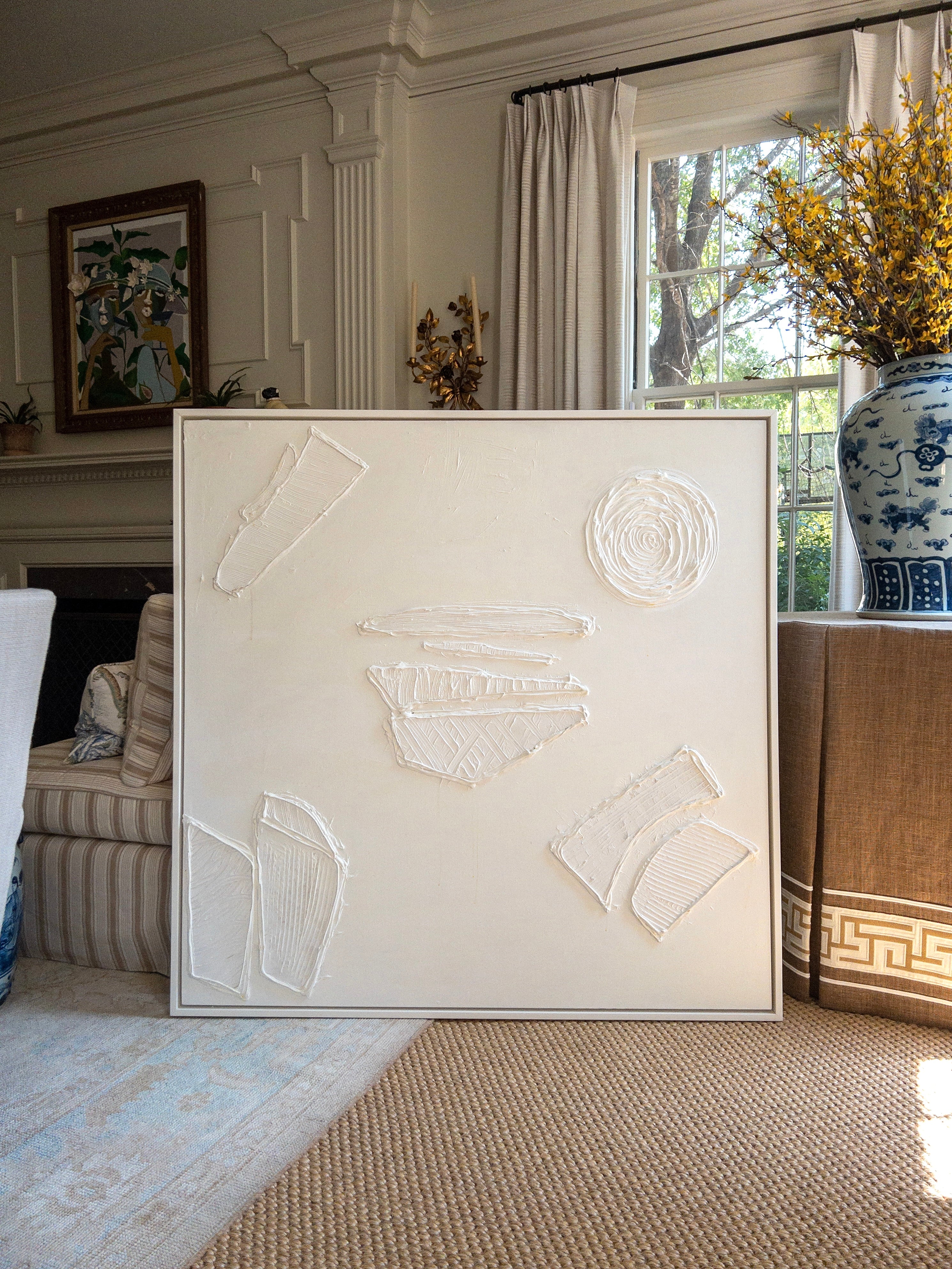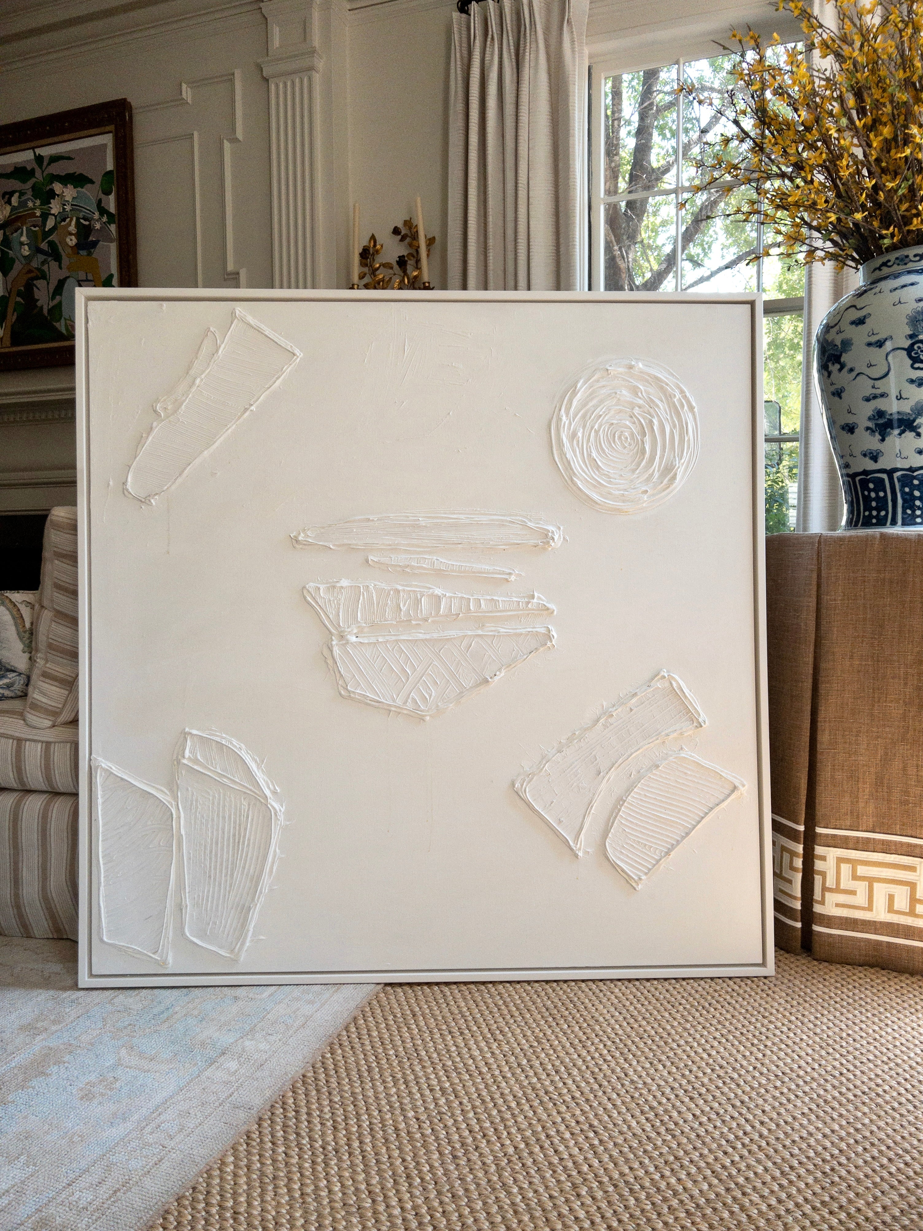 48x48 mixed media 3D textural white on white piece. Created on canvas and framed in custom white float frame. Signed on the back.
